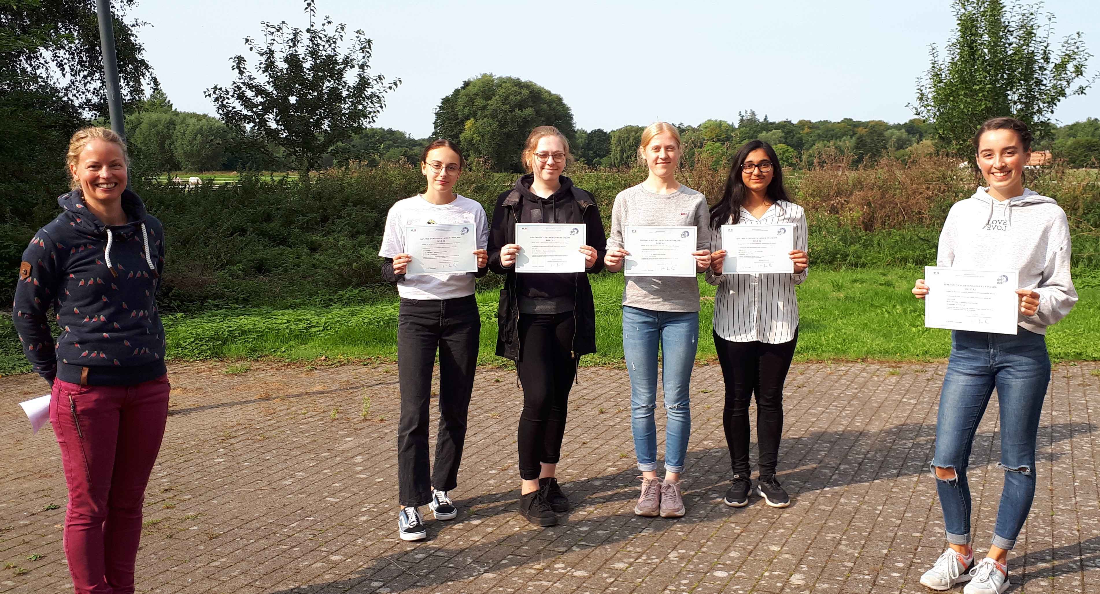 Die DELF A2-Zertifikate wurden den Absolventinnen Emma Stamm, Nina Wan, Martha Plagemann, Visha Ali Naz und Klara Poier (v. li. n. re.) von Frau Noske als AG-Leiterin überreicht. Herzlichen Glückwunsch zu dieser großartigen Leistung!