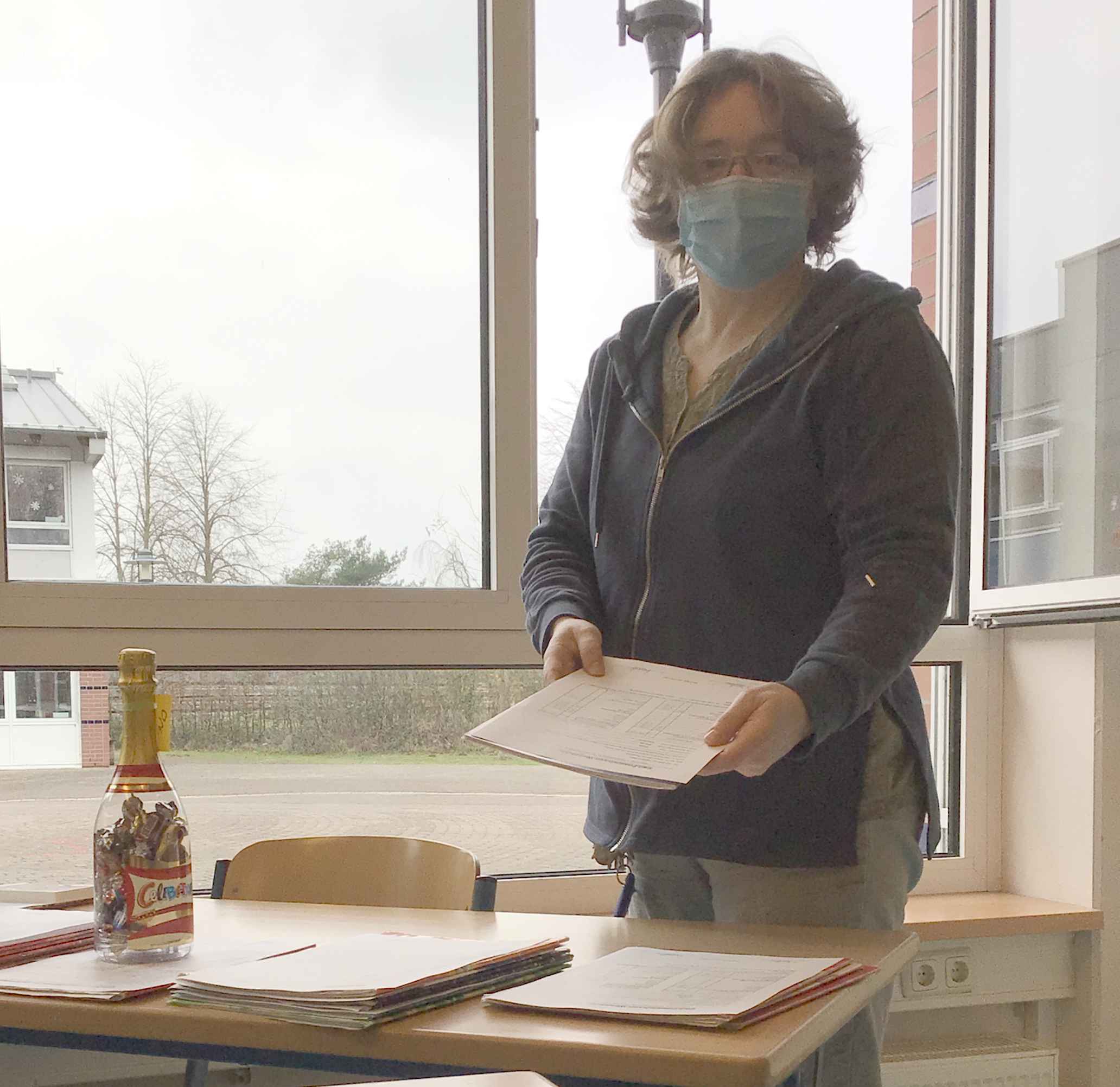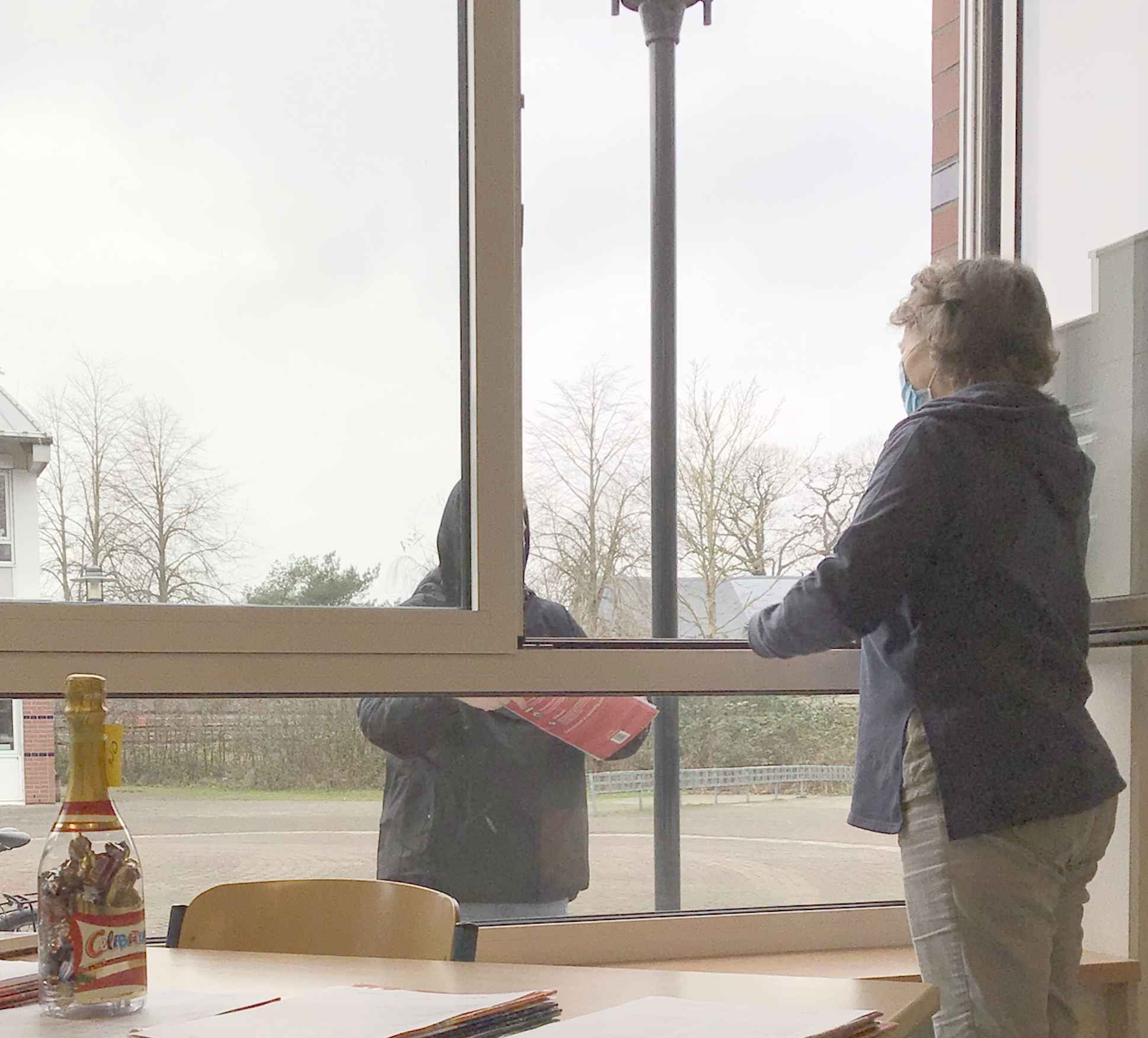 Durchs Fenster wurden Zeugnisse, eventuell Urkunden für die Teilnahme an Wettbewerben wie "Mathe-im-Advent" oder kleine Präsente für besondere Verdienste während der Coronazeit an die Schüler gereicht.