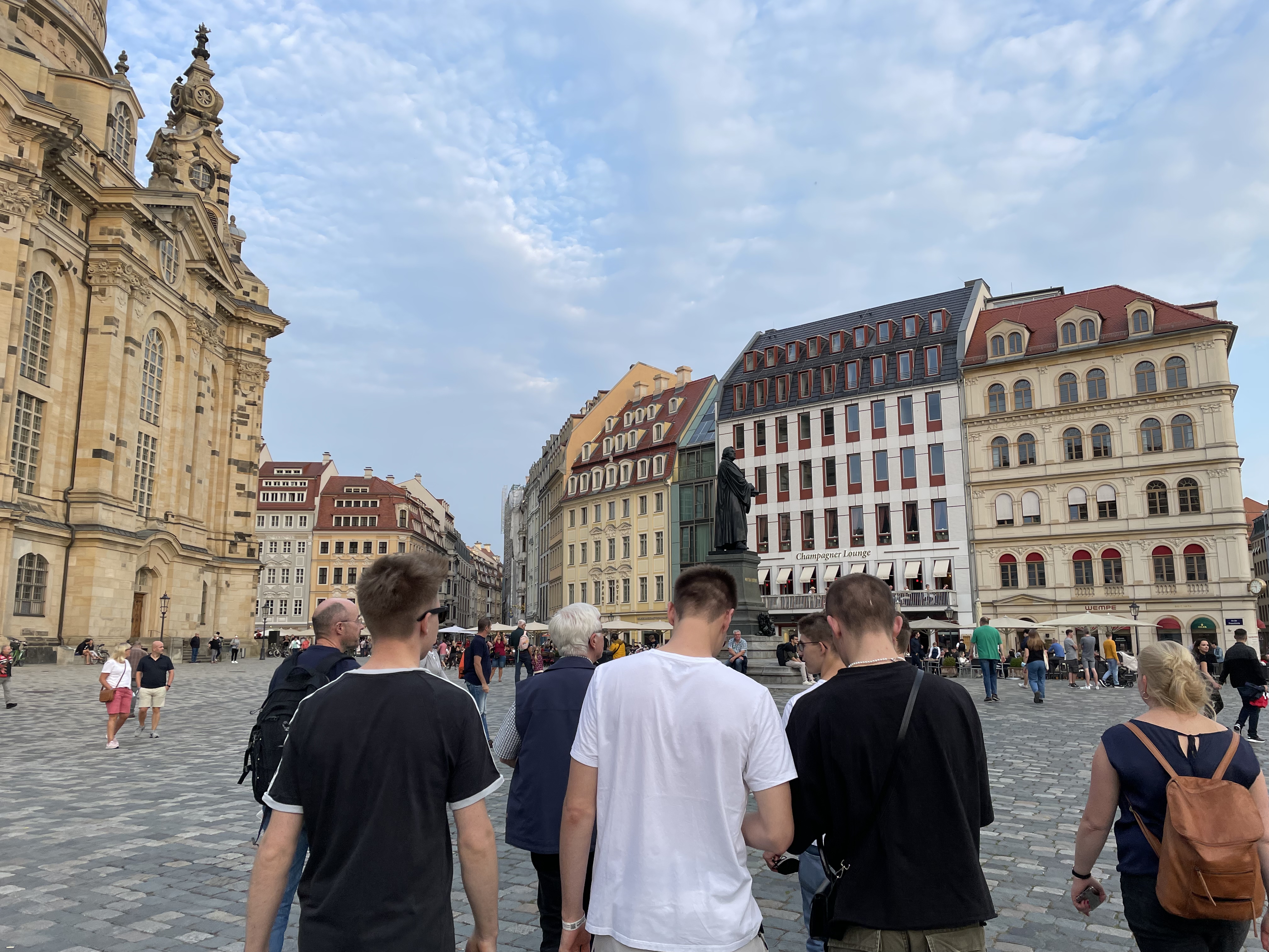 Unsere Kursfahrt begann am Sonntag, den 26.09., um 8 Uhr morgens am Elmshorner Bahnhof mit dem Aufbruch in Richtung Dresden. Die Zugfahrt verlief weitestgehend reibungslos, so dass wir um ca. 15 Uhr am Dresden HBF ankamen. Nachdem wir kurz Zeit hatten, unsere Zimmer zu beziehen, ging es um 16 Uhr gemeinsam in die Innenstadt. Dort wartete eine interessante Führung durch die Altstadt auf uns. Die Stadtführung umfasste z.B. den Dresdner Zwinger, die Frauenkirche und die Semperoper. Nach der Führung begaben wir uns in Richtung Neustadt und hatten die Möglichkeit, uns in kleineren Gruppen den kulinarischen Seiten Dresdens zu widmen. Anschließend fanden die einzelnen Gruppen wieder zusammen und trafen sich vor einem Späti, um sich wenig später wieder zurück zum Hostel zu begeben. Um halb 12 versammelten sich alle auf der Dachterrasse, um Hannas 18. Geburtstag zu feiern und den ersten Abend angemessen ausklingen zu lassen.