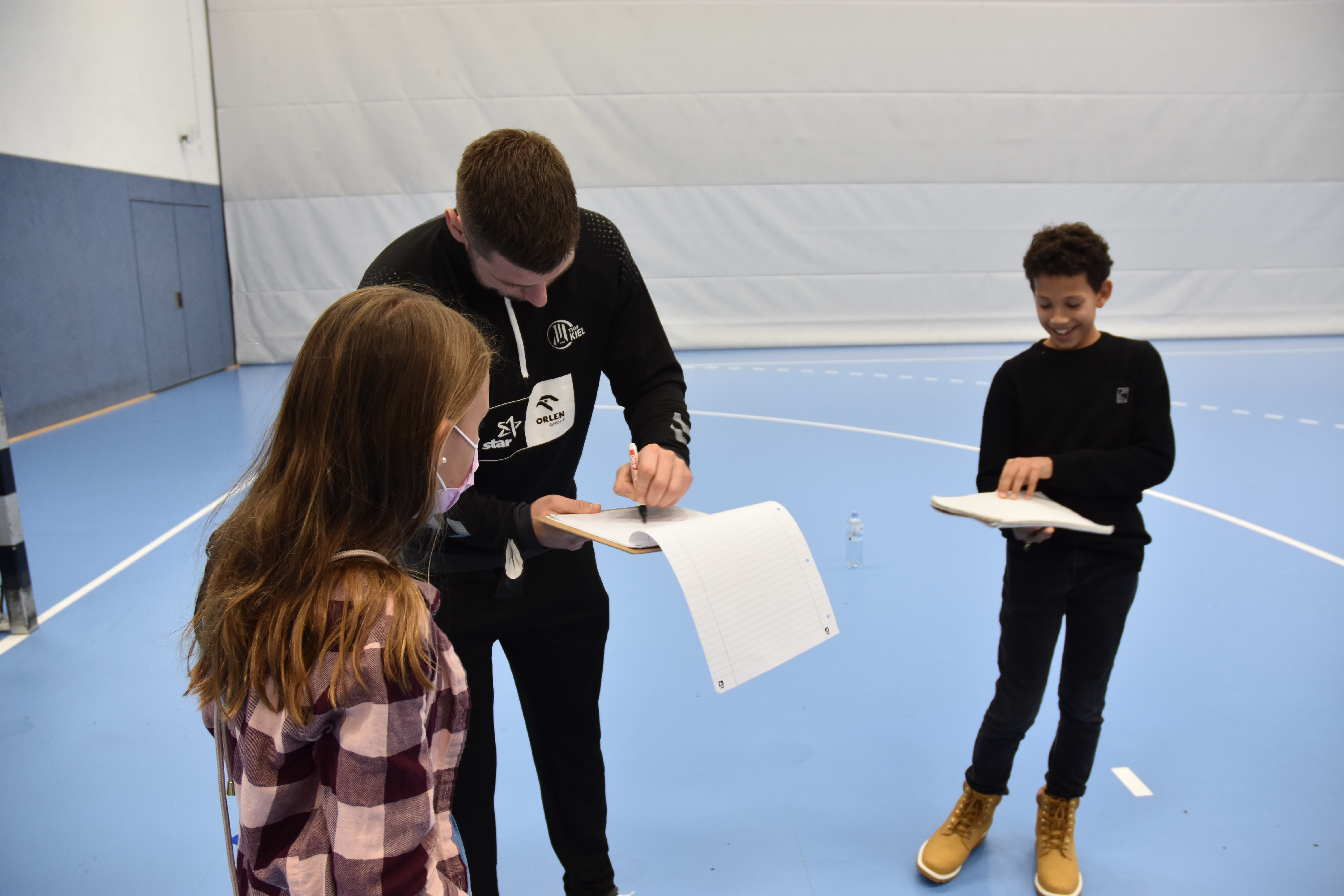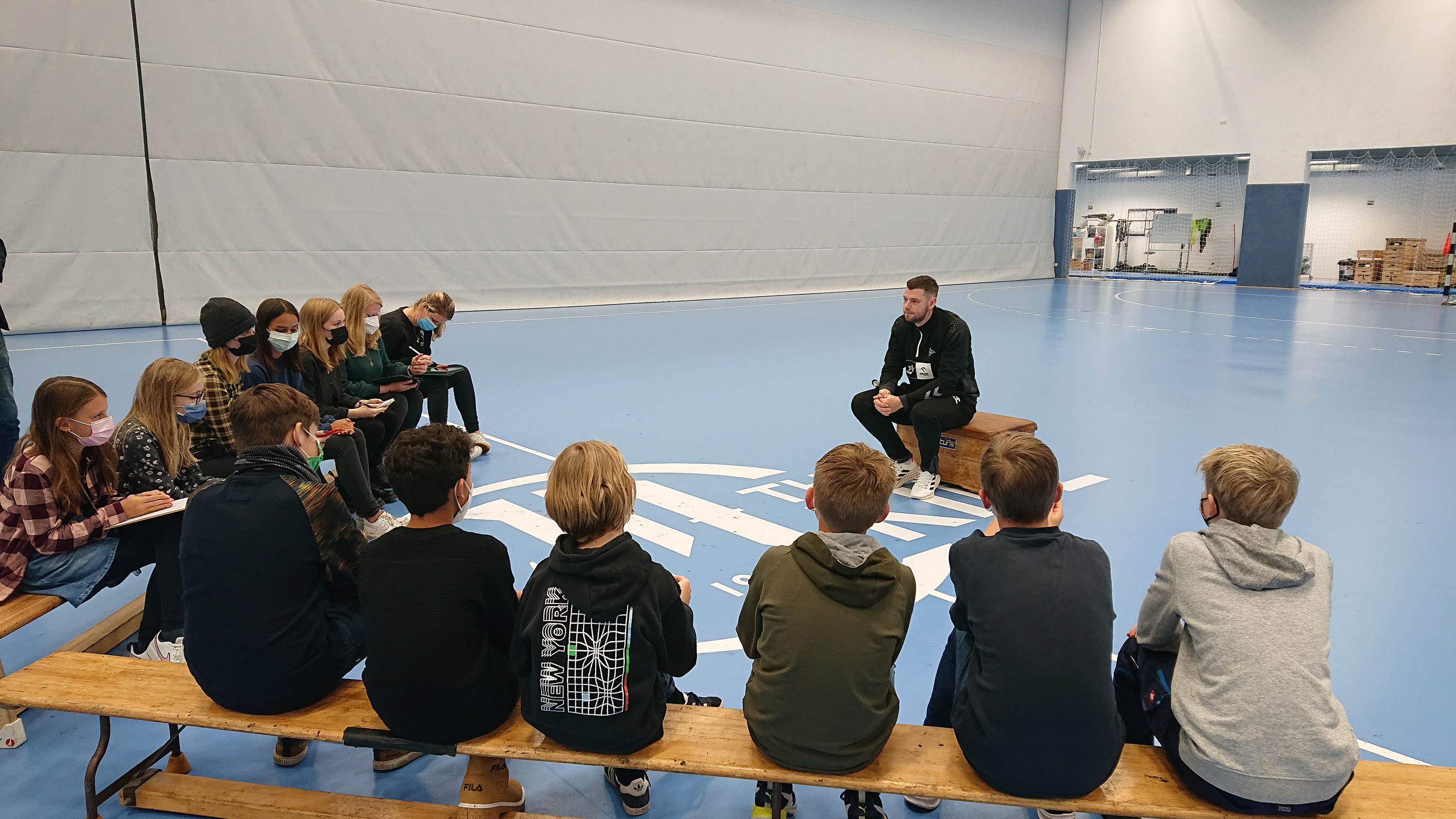 Und dann kam der Höhepunkt des Tages: Der Handballprofi machte es sich mit uns mitten in der Trainingshalle in einem Stuhlkreis gemütlich und stellte sich über eine Stunde lang unseren unzähligen Fragen.