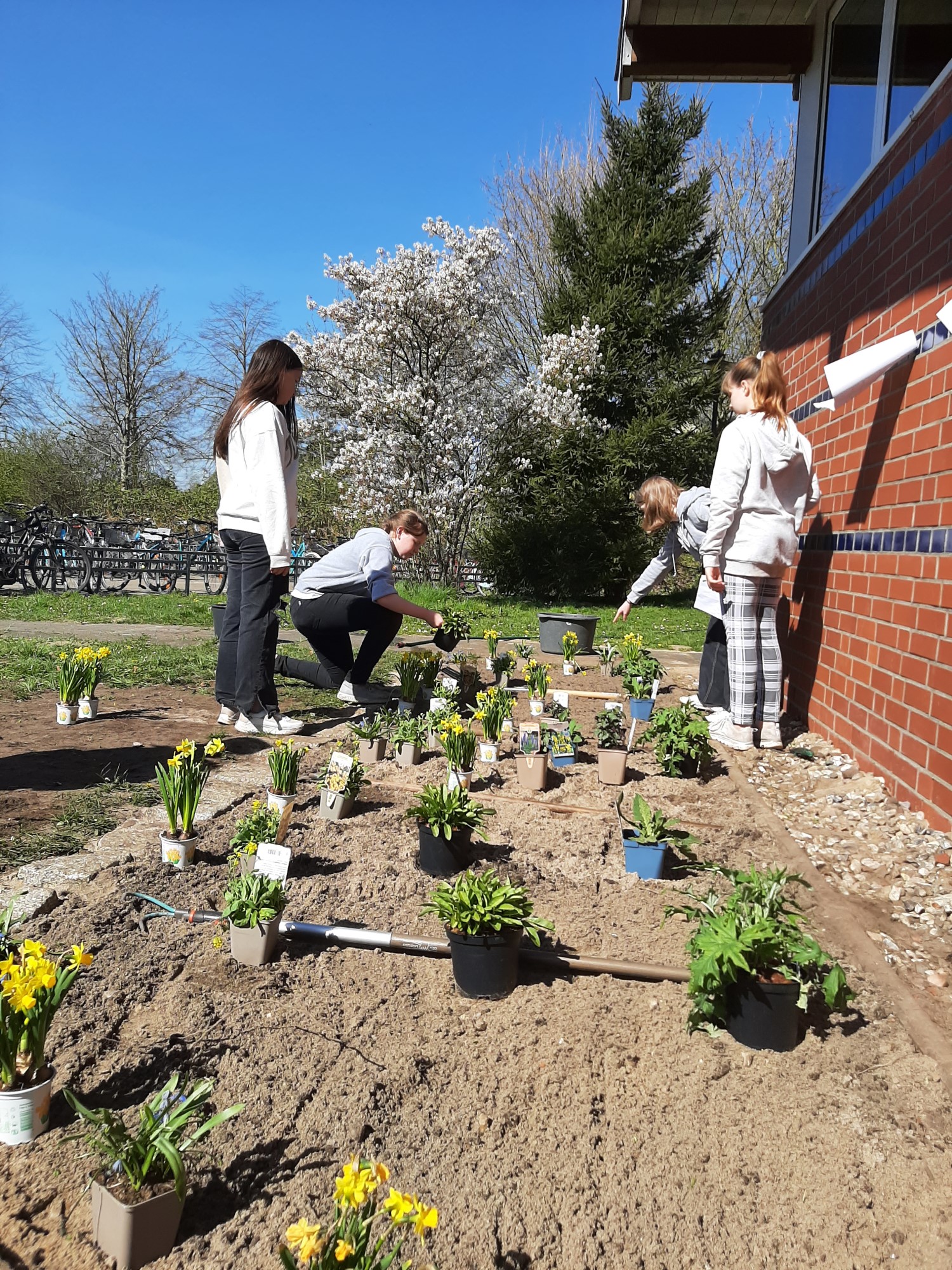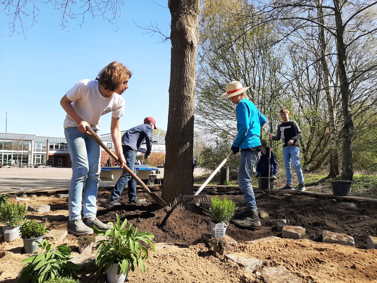 Die Klasse 7c kümmerte sich beim Nachhaltigkeitstag um das Blumenbeet an der Sporthalle und um die Kräuterspirale bei der Mensa. Natürlich haben wir das nicht alleine gemacht, wir hatten Unterstützung aus der Oberstufe und ohne Frau Westhoff und Frau Chen wäre dies gar nicht möglich gewesen, dafür auch nochmal vielen Dank!