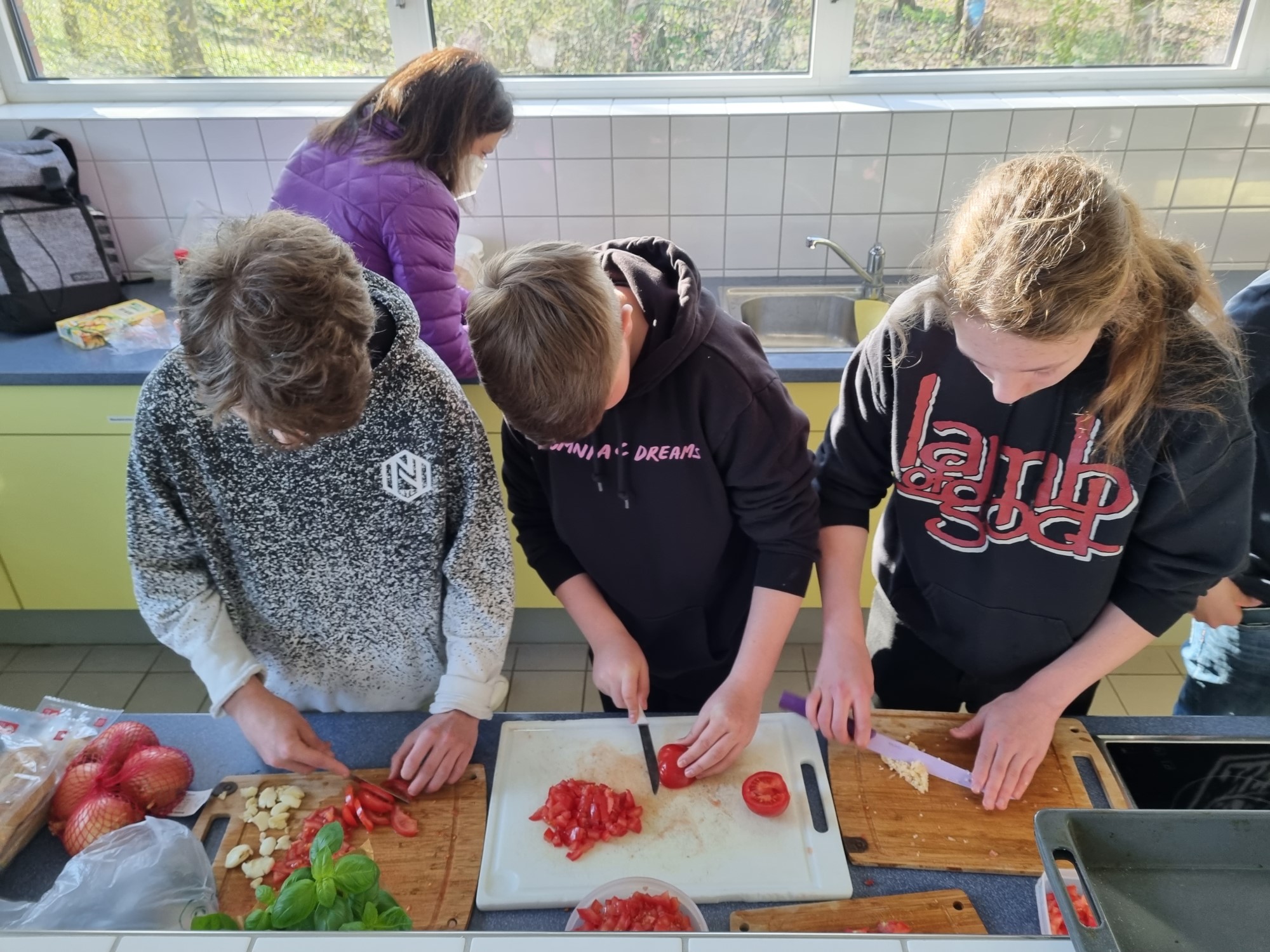 Die Klasse 8b hat am Nachhaltigkeitstag vegan gekocht und gebacken. Dabei haben alle aufgepasst, nichts zu verschwenden und auch hinter sich aufgeräumt.
