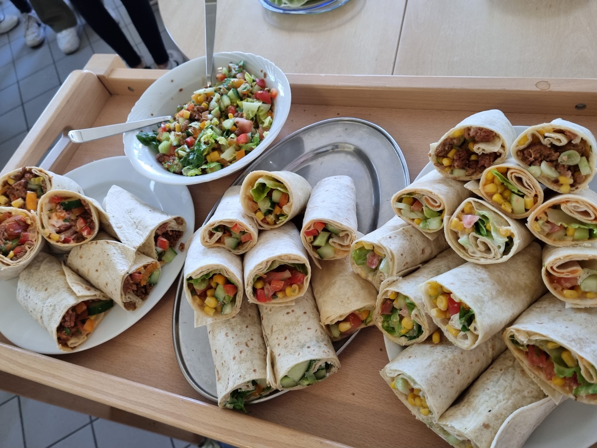 Die gekochten und gebackenen Gerichte: Für die Vorspeise gab es Bruscetta und Sommerrollen mit Mango und Tofu, den Hauptgang bildeten Burritos und Kartfoffelspieße und Lotus-Keks-Muffins, Brownies und Obstspieße mit Schokoladenüberzug rundeten das Menü ab.