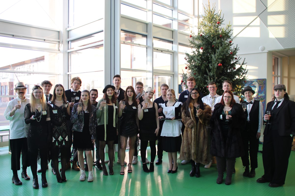Im Rahmen eines Wandertags hatte sich der Kurs entschieden, die Schule gar nicht zu verlassen, sondern in Form eines Krimidinners auf Zeitreise zu gehen. Der historische Bezug war gegeben und die Gruppe neugierig auf die Herausforderung. Selbstkreiertes Fingerfood und alkoholfreier Sekt sorgten für die nötige Energie, um Rätsel zu entschlüsseln, Geheimnisse aufzudecken und die eigene Rolle beizubehalten.