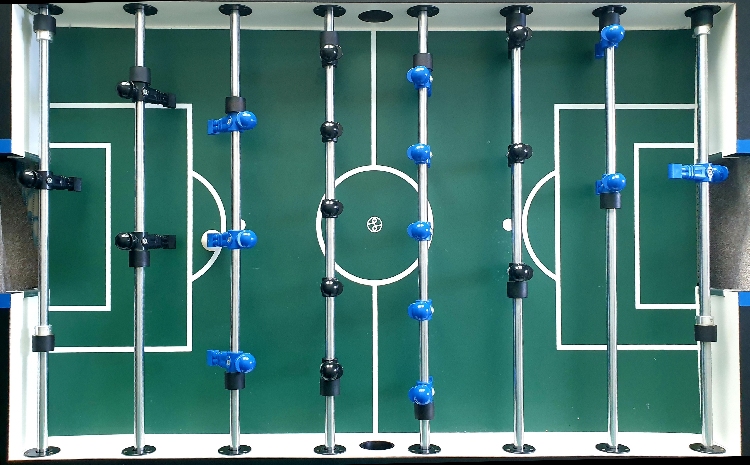 Schülerinnen und Schüler trainieren ihre Fertigkeiten und Grundkenntnisse im Tischfußballspiel.