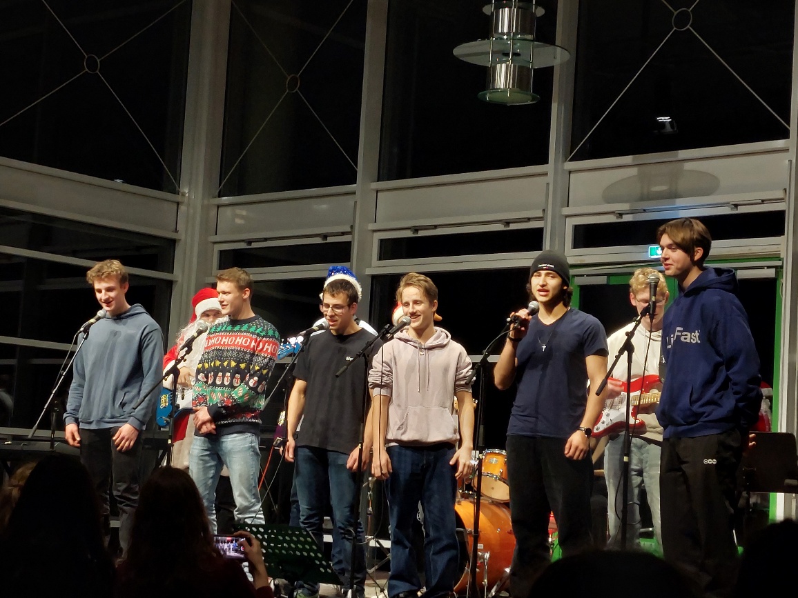 Den Abschluss des Abends bildete der Musik-Kurs des 12. Jahrgangs - inklusive einem echten Weihnachtsmann! Mit dem Klassiker "Feliz Navidad" sorgten sie bei allen Anwesenden für einen Ohrwurm...über mehrere Tage!