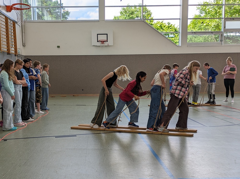 Der 6. Jahrgang betätigte sich sportlich: Europäische Sportarten standen im Mittelpunkt des Tages. Mithilfe einer Stempelkarte galt es, so viele europäische Sportarten wie möglich auszutesten. Dabei wurde es auch ziemlich ungewöhnlich: Neben Cricket und Boule war beispielsweise auch Mehlschneiden eine besonders beliebte Station - eine griechische Sportart, die alle ziemlich ins Schwitzen brachte!