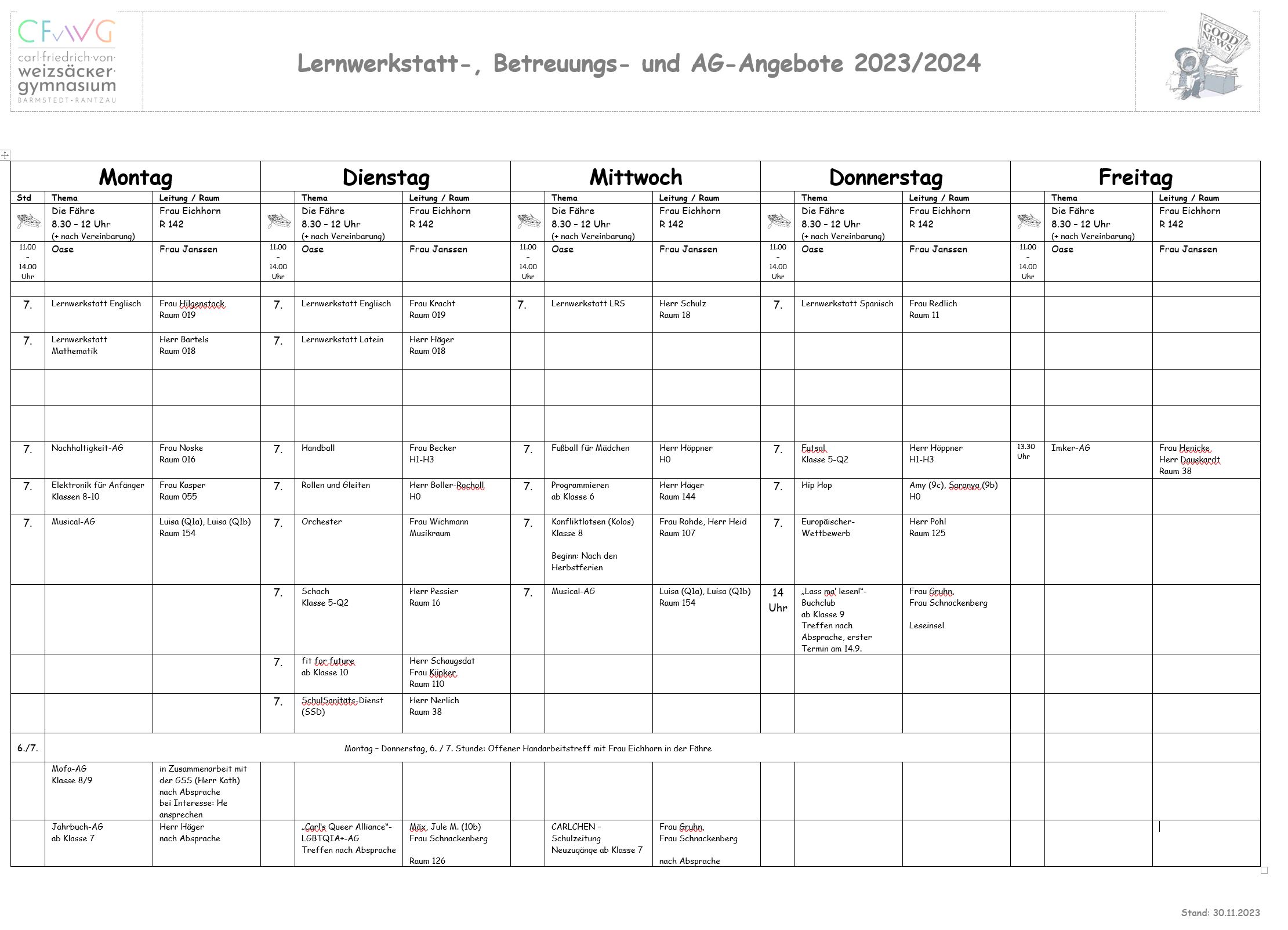 Bitte "schnuppert" in der ersten Woche einfach in die AGs hinein! Kommt also vorbei oder kontaktiert die Leitenden der AGs.